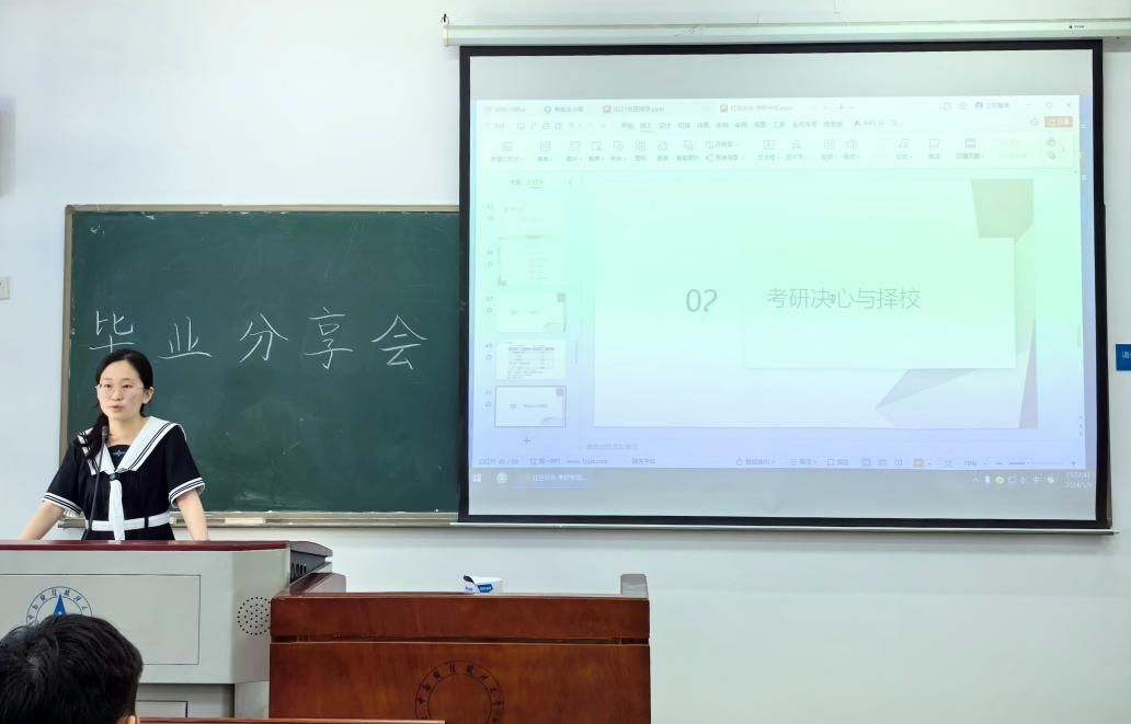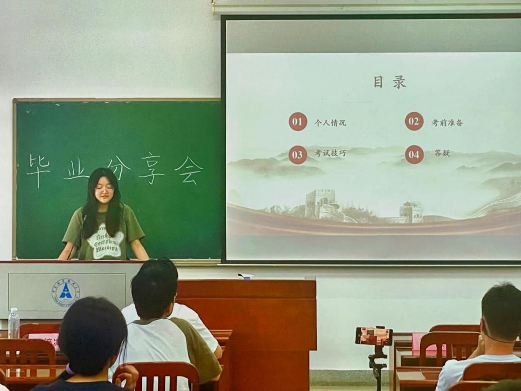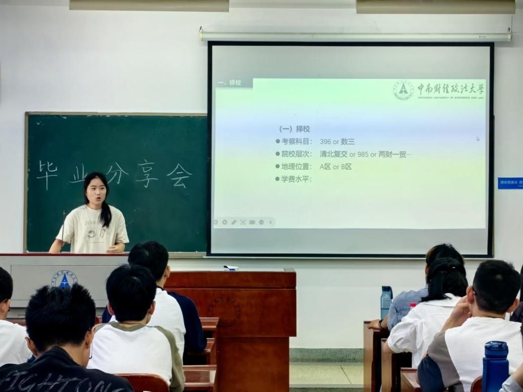 在考研经验分享环节中,考研至南京大学的余敏围绕择校、备考和心态三方面一一展开。在剖析考研备考的策略与技巧后,她强调了扎实基础、合理规划、积极应对等关键要素。通过讲述自己在面对考试压力时保持冷静的心得体会,她鼓励同学们以积极的心态迎接挑战,要相信“坚持到底就是胜利”。考研至中央财经大学的陈薇从择校、考情分析和备考经验三个方面出发,提醒同学们要结合自身基础和目标院校的具体情况,去制定考研计划。同时,她还推荐了自己备考时学习的专业课教材和辅导书籍,希望大家保持良好的学习状态,“做好自己应该做的事情”,以水到渠成的姿态考取理想院校。考研至永乐高ylg888888的牛若冰以自己的心路历程为例,重点指出考研需要保持积极的心态和坚定的信念,建议大家在备考过程中要学会调整心态,敢于面对和克服正常的焦虑情绪,不需要与其他同学抢复习进度。